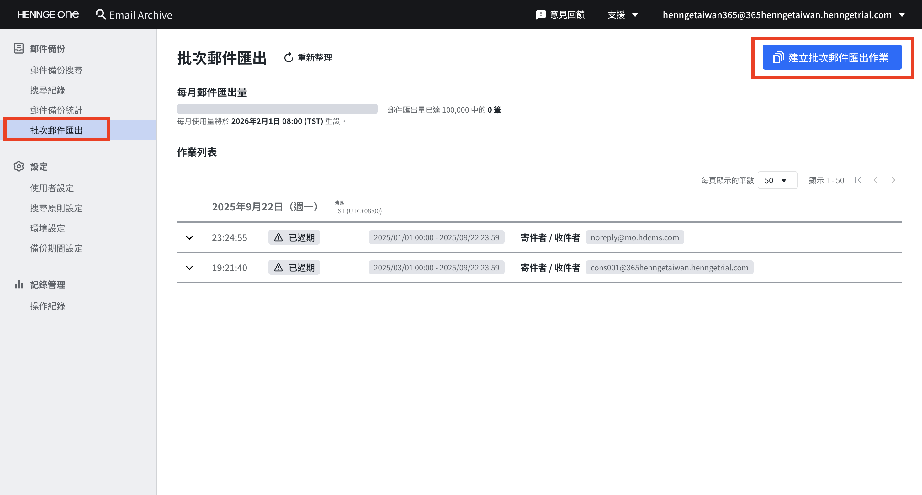 可透過指定期間與電子郵件地址,一次性匯出最多 10 萬封郵件(每月限一次)。既有的「多封郵件下載功能」一次僅能下載最多 200 封郵件,當目標郵件數量龐大時,取得作業需耗費大量時間。透過本功能,可一次性完成郵件匯出。