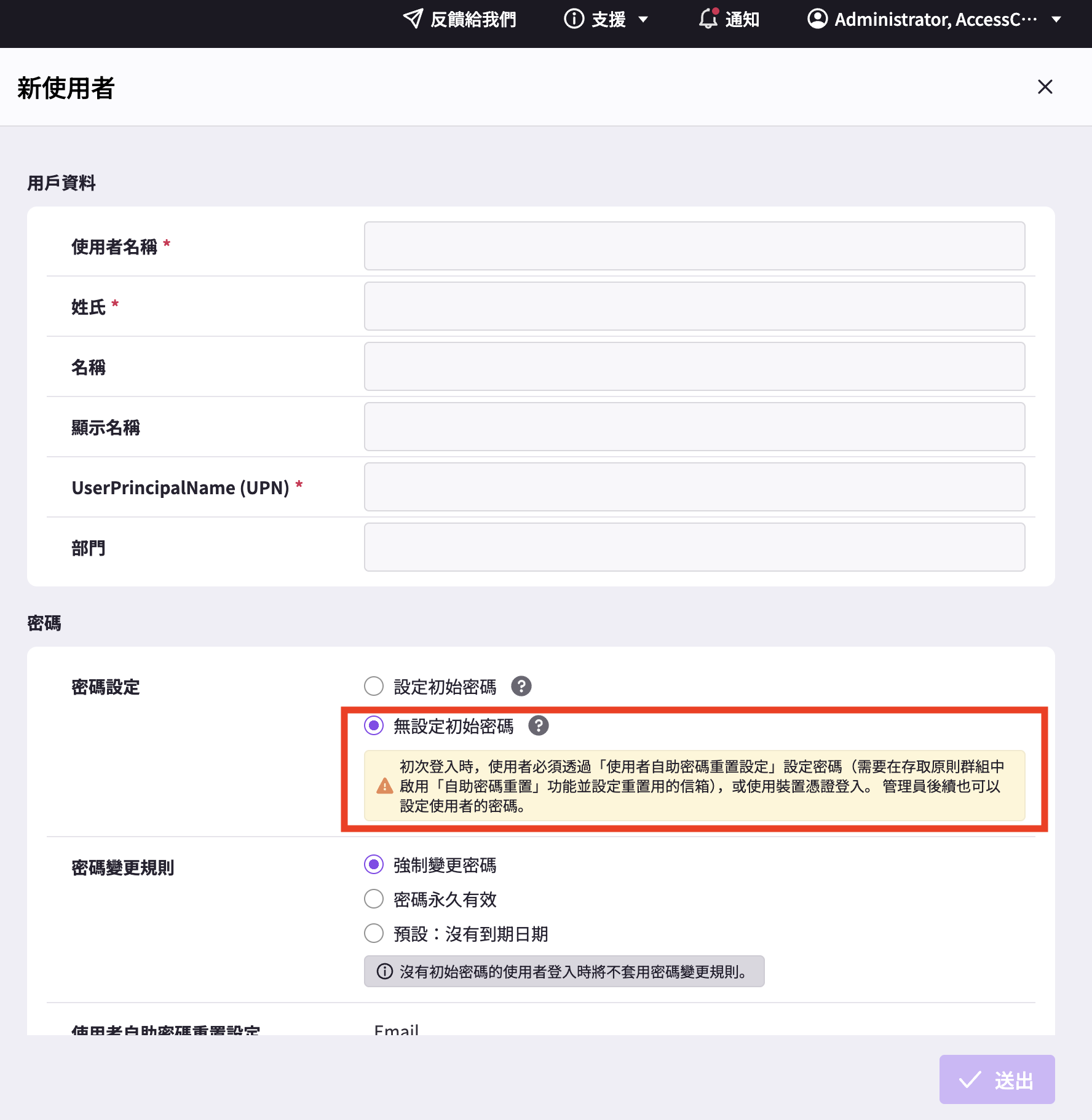 過去未設定初始密碼,就無法建立新使用者。但現在已可選擇「無設定初始密碼」來建立新使用者。