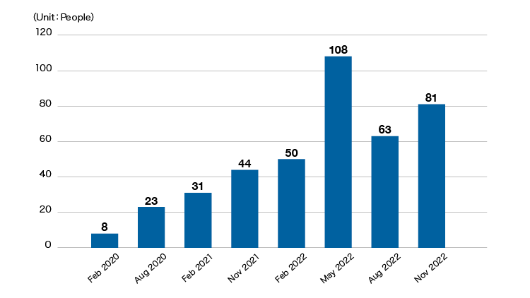 In November 2022, 81 employees from the company took the TOEIC S&W (Speaking & Writing) IP Test. This was approximately 10 times the number of 8 people who took the test in February 2020. The average in-house score remained around 290 (on a 400-point scale), with 287.7 (178 examinees) in December 2022 and 292 (35 examinees) in December 2019.