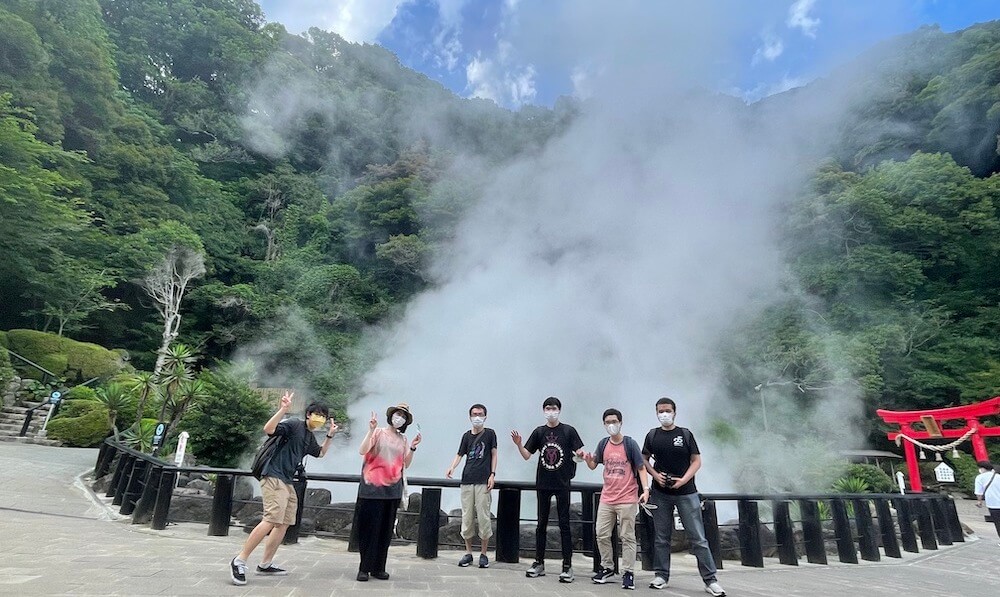 同じ飛行機の便だったHENNGEメンバーたちと、コバルトブルー色の温泉「海地獄」へ。