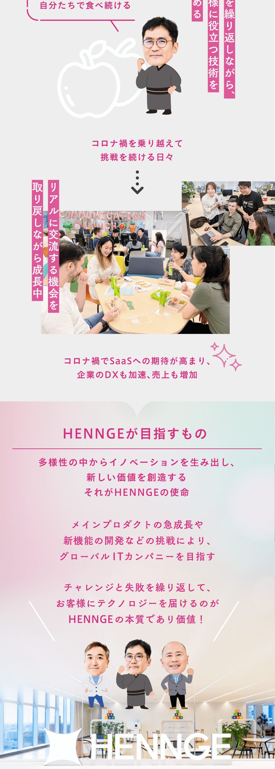 漫画「3分で分かるHENNGE」 事業・プロダクト 働き方・カルチャー ※HENNGEでは一緒に、 変化する・チャレンジする、 メンバーを募集しています。 募集中の職種に関してはこちらをご参照ください。 あわせて読みたい記事 HENNGEの変なノベルティ ハロウィンイベントで変わる 祝開催100回!HENNGEで8年続くMTSとは?