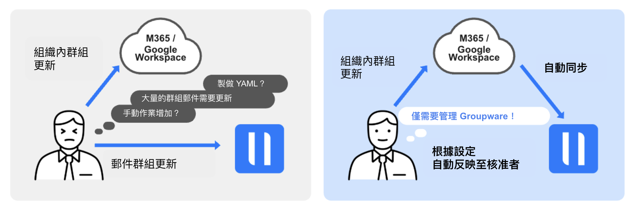 過去因無法使用 Microsoft 365/Google Workspace 的群組同步功能,而收到了許多改善建議,例如「維護成本高」、「因此遲遲無法導入審核流程」等。