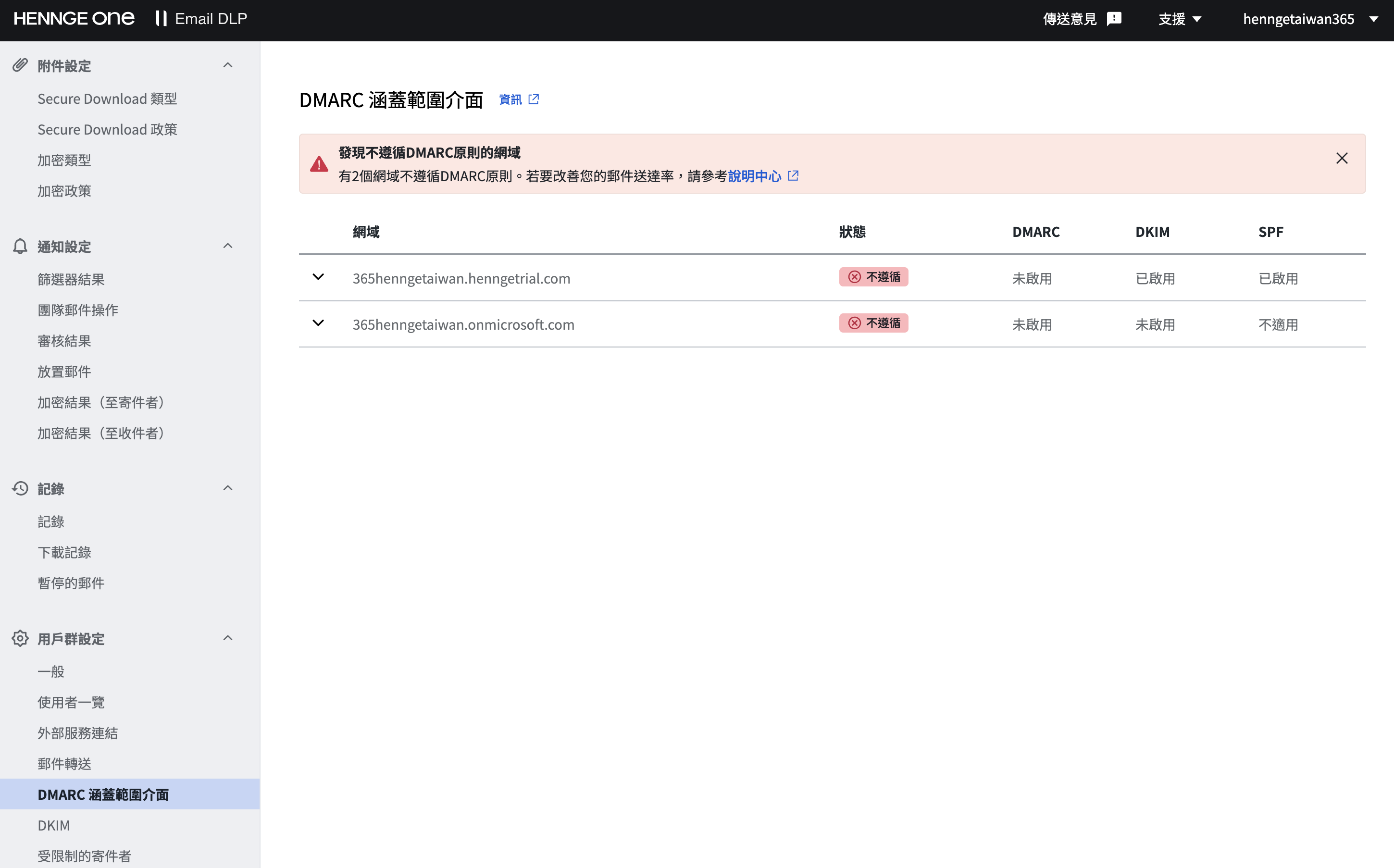 - 已註冊於 Email DLP 網域之 DMARC / SPF / DKIM 狀態