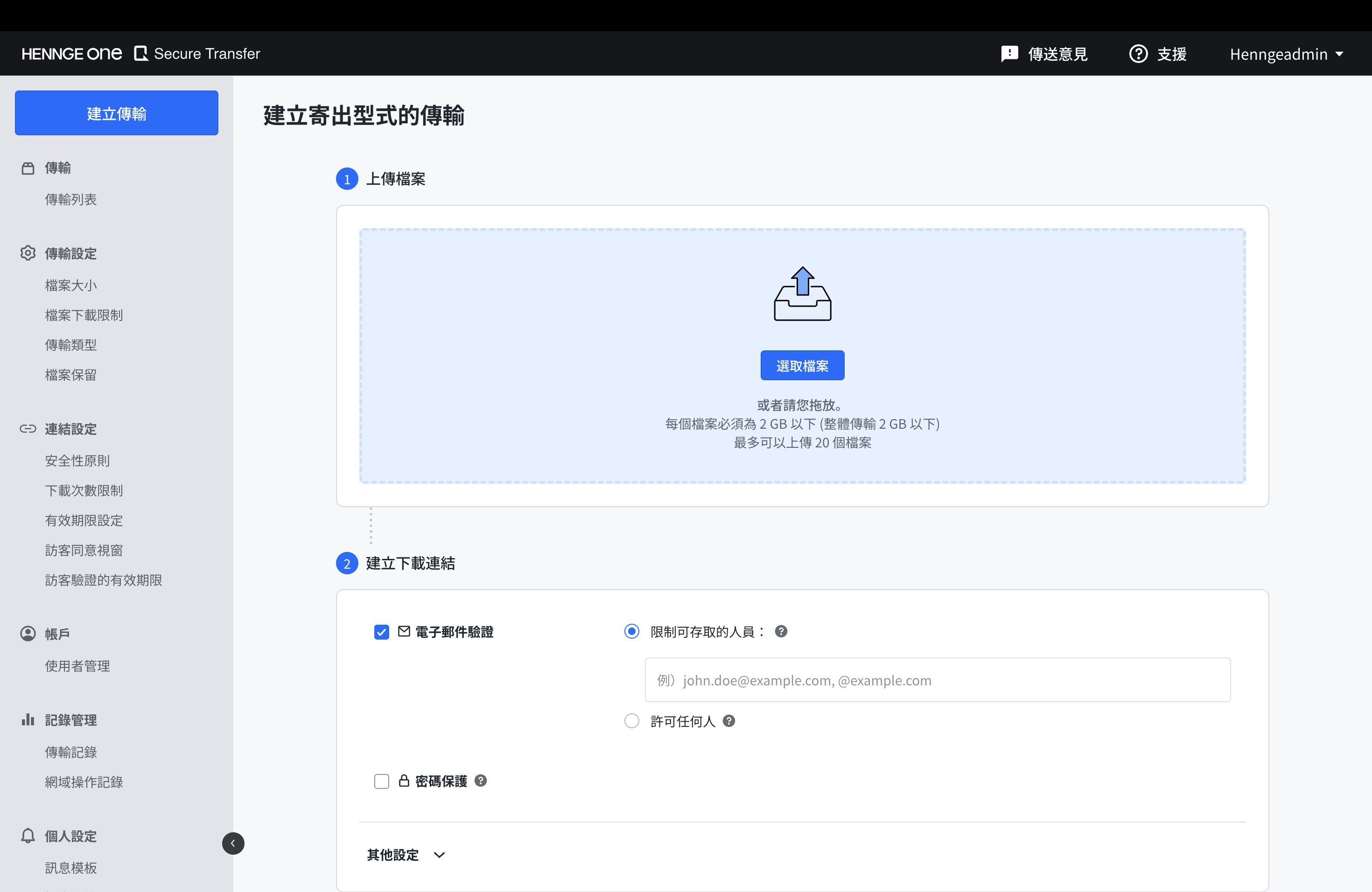 HENNGE Secure Transfer 大檔案傳輸是企業最安全的對外交換檔案途徑。上傳檔案後得到的連結可以加密、限定網域開啟,以及設定到期天數等。