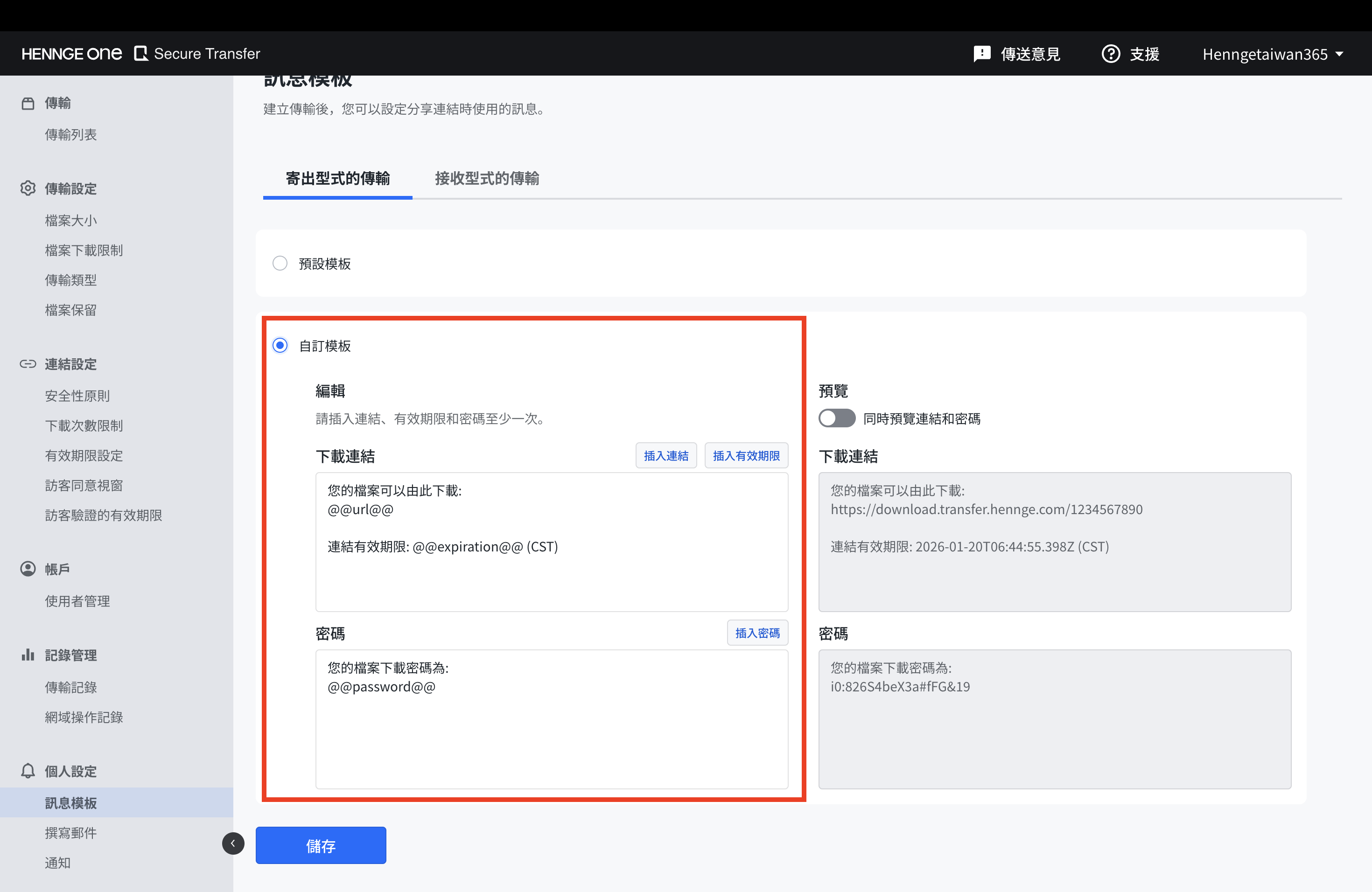 過去分享連結時,訊息內容為固定模板。現在可於【個人設定】中自訂分享訊息,並可插入「URL」「有效期限」「密碼」等變數,以減少手動輸入作業。