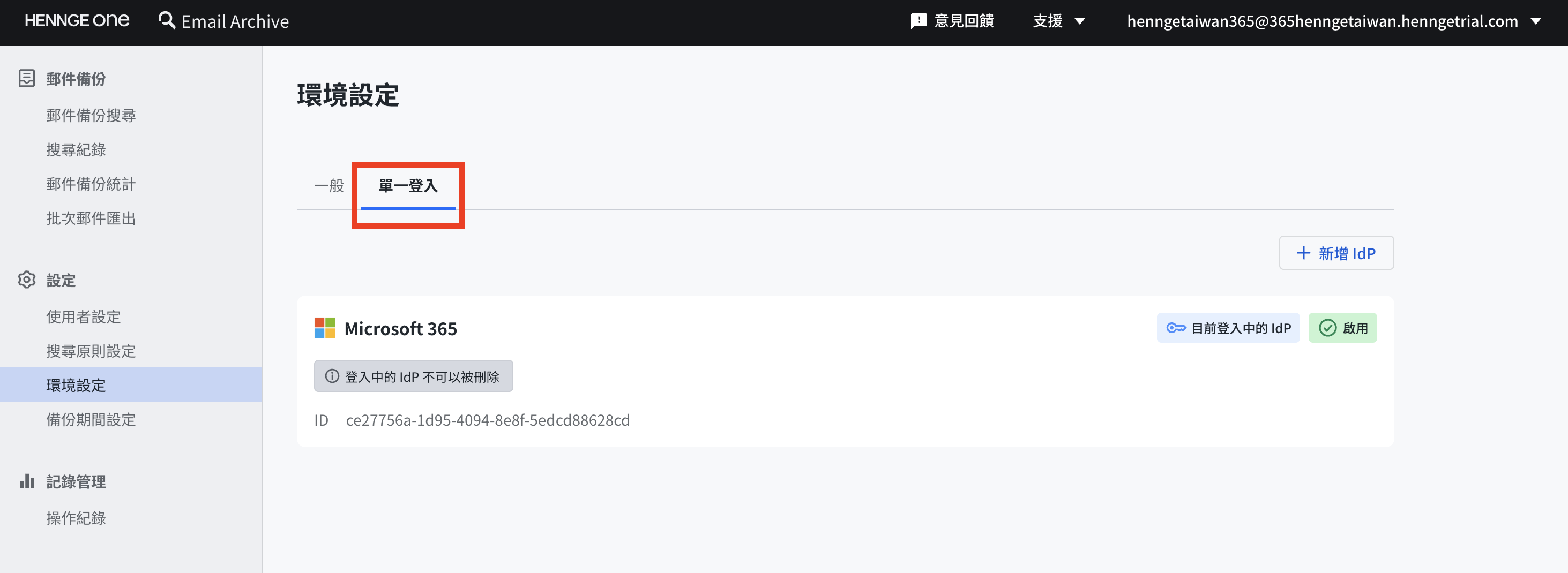 可於 【一般設定】→【單一登入】 中新增或刪除可存取的 IdP,並確認已設定的認證服務(Microsoft 365 或 Google Workspace)。此功能主要用於應對 Groupware 變更時的 IdP 更新,或新增可存取郵件備份的組織等情況。目前最多可註冊 2 個可存取的 IdP(Google / Microsoft 租戶)。
