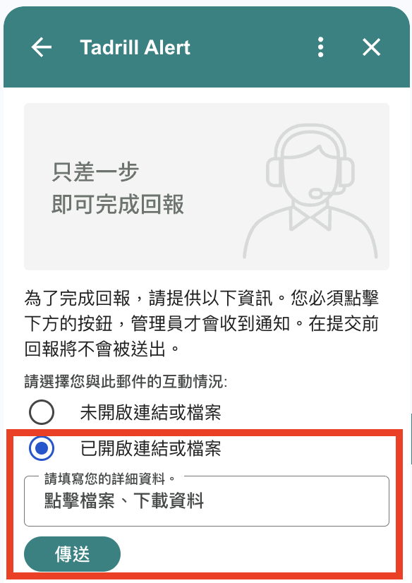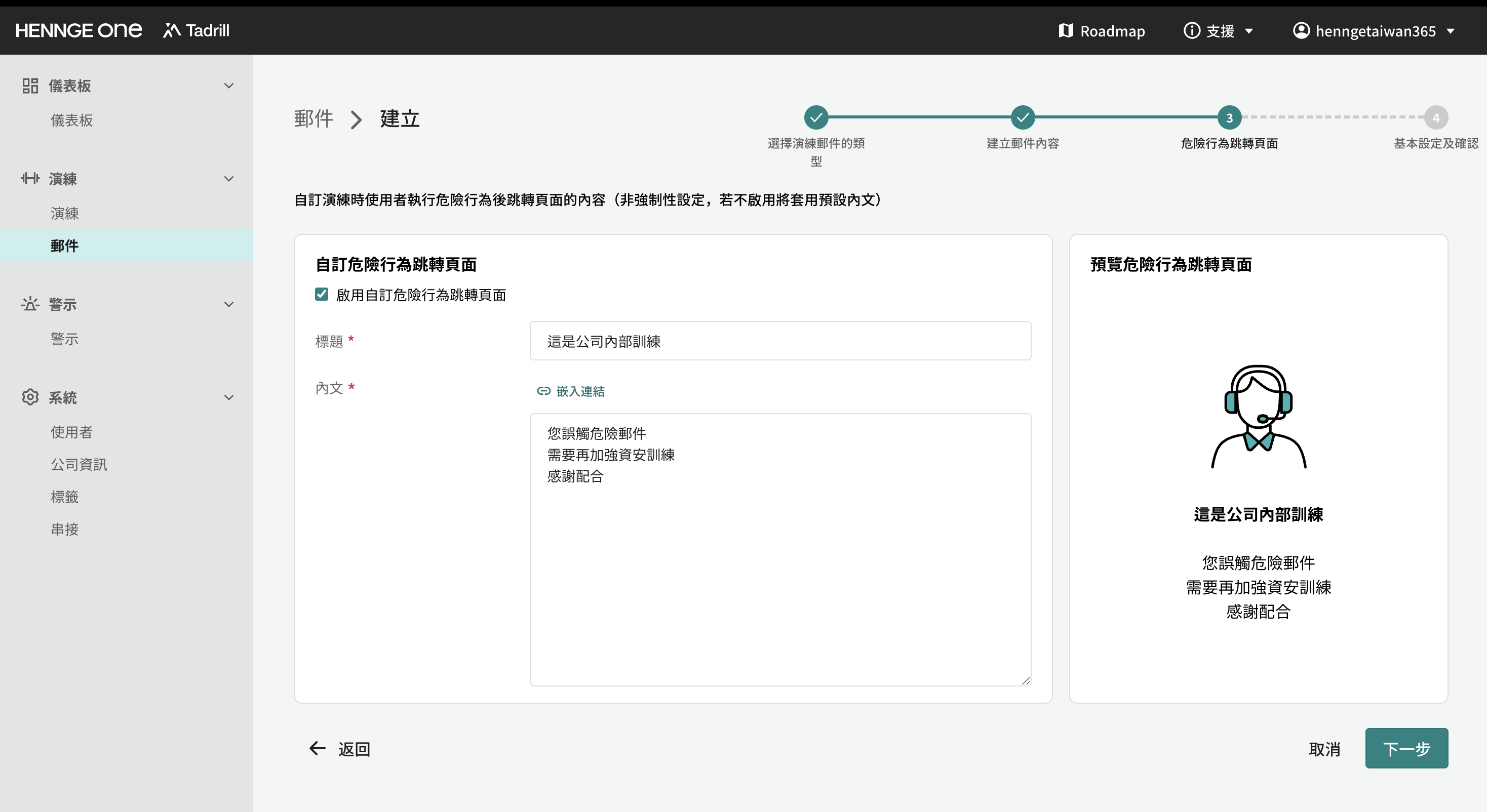 為回應眾多需求,我們新增此自訂功能!除了可顯示演練後續指示之外,還可加入聯絡窗口資訊,或是展示給進行危險行為者的內容 URL,功能非常多元靈活!