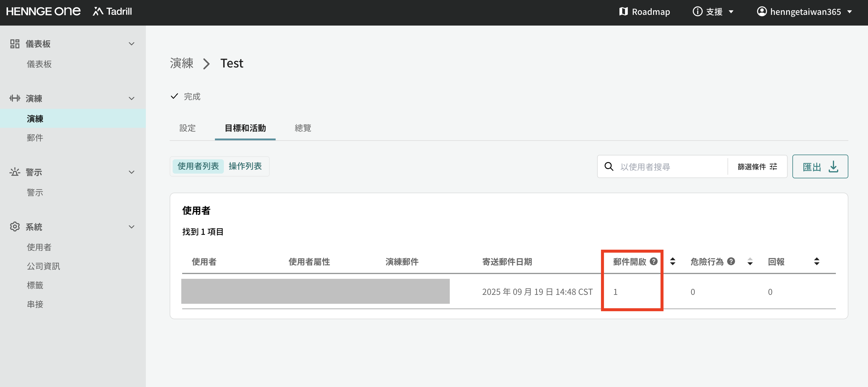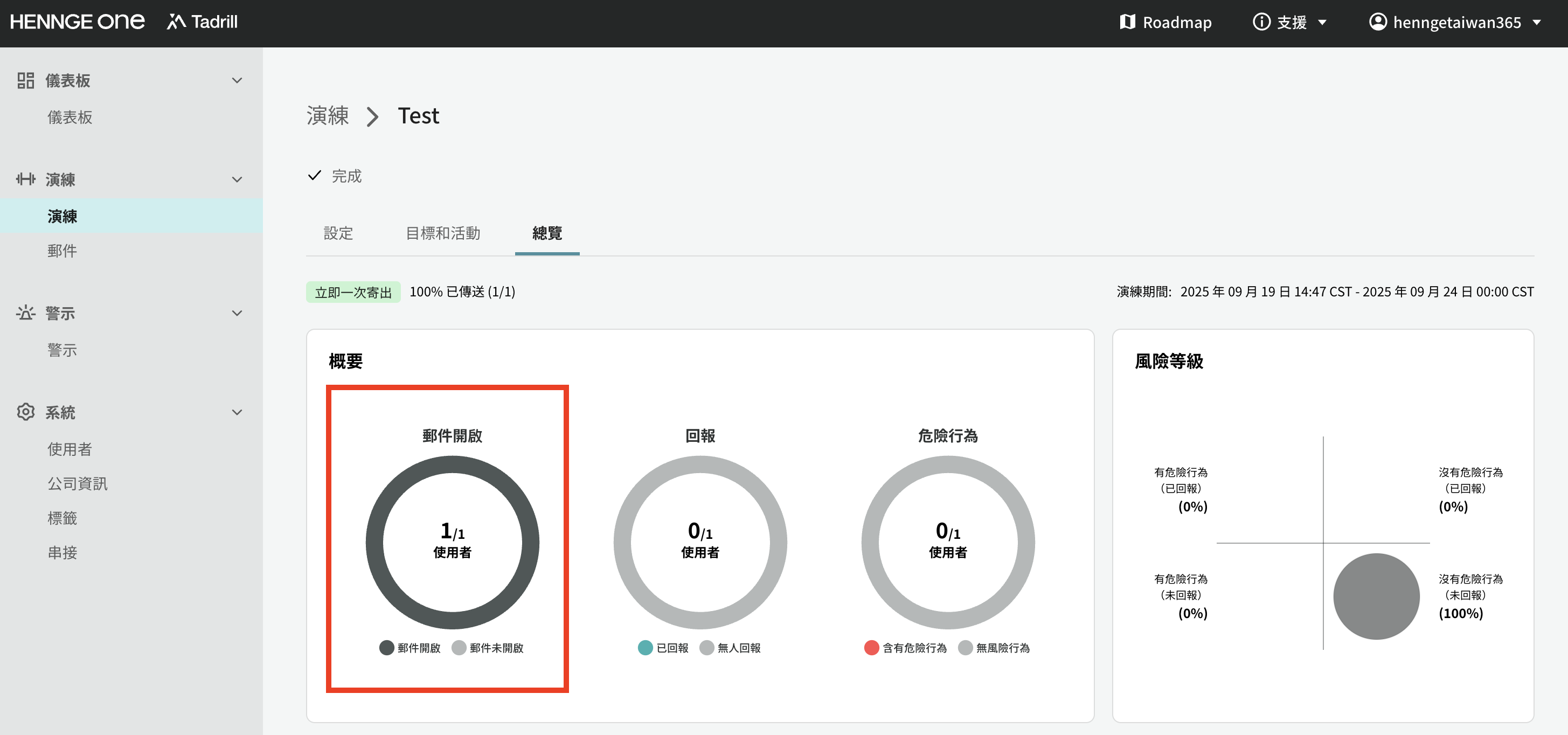 ※ 本功能發佈前所寄送的訓練郵件結果中,「郵件開啟」數量將顯示為「-」,且不會顯示相關圖表。